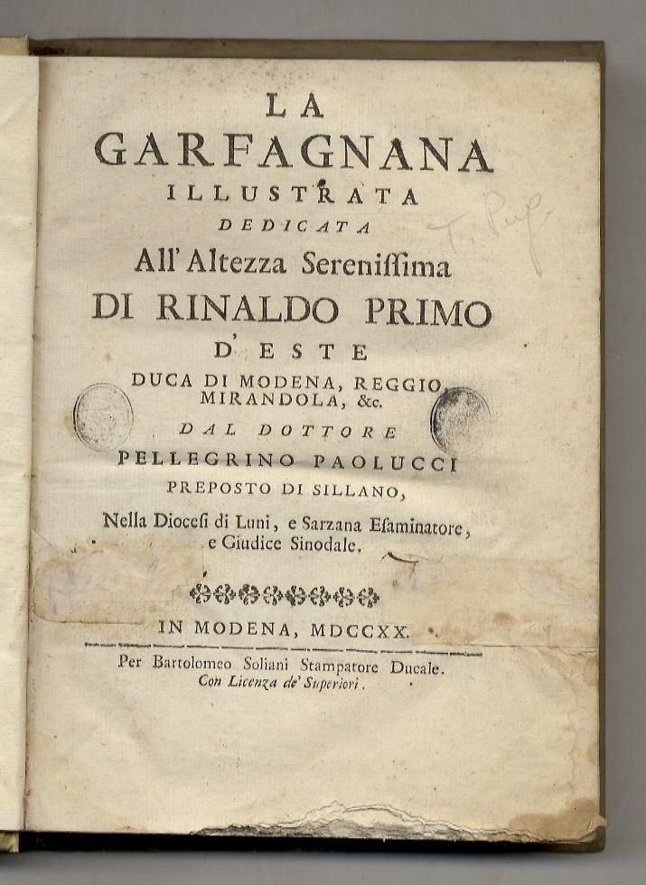 La Garfagnana illustrata dedicata all’altezza serenissima di Rinaldo primo d’Este […] dal dottore Pellegrino Paolucci preposto di Sillano […].